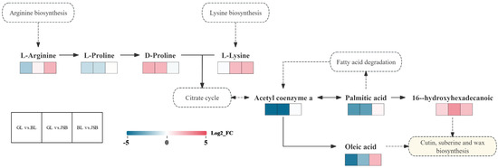 Overview of metabolic pathways mapped to possible regulation of key metabolites in pairwise comparisons of GL vs. BL, GL vs. JSB, and BL vs. JSB. The colored box of each metabolite indicates the corresponding log2_FC value. Small red rectangles indicate significant upregulation of metabolites between groups; small blue rectangles indicate significant downregulation of metabolites between groups; small white rectangles represent insignificant differences between groups; solid arrows represent facilitation and dashed boxes indicate different metabolic pathways.