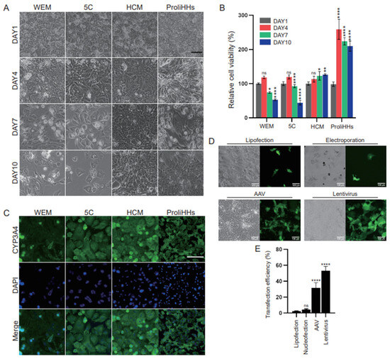 Comparison of cell culture and gene delivery efficiency in primary mouse hepatocytes. (A) Morphological changes in hepatocytes under four different culture media: WEM, 5C, HCM, and ProliHHs. Scale bar: 100 μm. (B) Cell viability under 4 culture media on day 1, day 4, day 7, and day 10. N = 3, * p < 0.05, ** p < 0.01, **** p < 0.0001. “ns” means not significant, p ≥ 0.05. (C) CYP3A4 immunofluorescence of the four media at day 10. Scale bar: 100 μm. (D) EGFP expression in hepatocytes with exogenous DNA delivered using four strategies: electroporation, Lipofection, AAV, and lentivirus. Scale bar: 100 μm. (E) The percentage of EGFP-positive hepatocytes using different DNA delivery strategies. N = 3, **** p < 0.0001, “ns” means not significant, p ≥ 0.05.