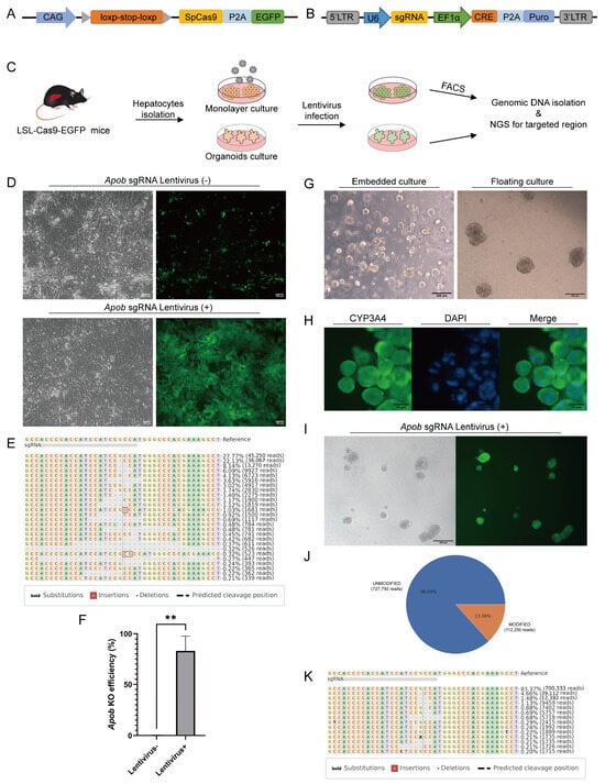 Lentiviral delivery strategy achieved genome editing of primary mouse hepatocytes cultured in both monolayer and organoid formats. (A) Schematic of LSL-Cas9-EGFP cassette knocked into the mouse Rosa26 locus. (B) Schematic of Cre-sgRNA lentiviral vector. (C) Schematic describing experimental workflow used to quantify single gene knockout efficiency via lentivirus. (D) EGFP expression in LSL-Cas9-EGFP hepatocytes transduced with CRE and sgRNA co-expressing lentivirus in monolayer cultures. (E) Distribution of indels and deletions around targeting site for the Apob sgRNA in monolayer cultures. (F) Apob knockout efficiency. N = 3, ** p < 0.01. (G) Organoids of primary mouse hepatocytes. Left: embedded cultured in Matrigel, right: floating cultured in 5% (vol/vol) Matrigel. Scale bar: 200 μm. (H) CYP3A4 immunofluorescence of mouse hepatocytes organoids. Scale bar: 50 μm. (I) EGFP expression of LSL-Cas9-EGFP hepatocytes transduced with CRE and sgRNA co-expressing lentivirus in organoid cultures. (J) NGS results showing Apob knockout efficiency in hepatocytes organoids. (K) Distribution of inserts and deletions around targeting site for the Apob sgRNA in organoid cultures.