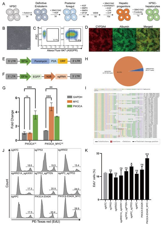 Genome editing of human pluripotent stem cell-derived hepatocytes. (A) Schematic describing the differentiation protocol from hPSCs to mature hepatocytes. (B) Morphology of hepatic progenitor cells differentiated from hPSCs. Scale bar: 100 μm. (C) Representative flow cytometric analysis showing the expression of ASGPR, a hepatic surface marker in hPSC-hepatocytes. (D) Co-immunofluorescence of CYP3A4 and Albumin in hPSC-hepatocytes. Scale bar: 100 μm. (E) Schematic of the oncogene ORF lentiviral vector. (F) Schematic of the sgRNA lentiviral vector. (G) Fold change in GAPDH, MYC, and PIK3CA mRNA between ORF overexpressed and control hPSC-hepatocytes. OE, overexpression. Two-way ANOVA analysis, N= 2, ** p < 0.01, *** p < 0.001, “ns” means not significant, p ≥ 0.05. (H) NGS results showing APC knockout efficiency in hPSC-hepatocytes. (I) Distribution of inserts and deletions around the targeting site for the APC sgRNA in hPSC-hepatocytes. (J) Flow cytometric analysis showing Edu incorporation 10 days after the introduction of oncogenic alterations into hepatic progenitor cells. (K) Percentage of Edu-positive cells. N = 3, * p < 0.05, ** p < 0.01, “ns” means not significant, p ≥ 0.05.