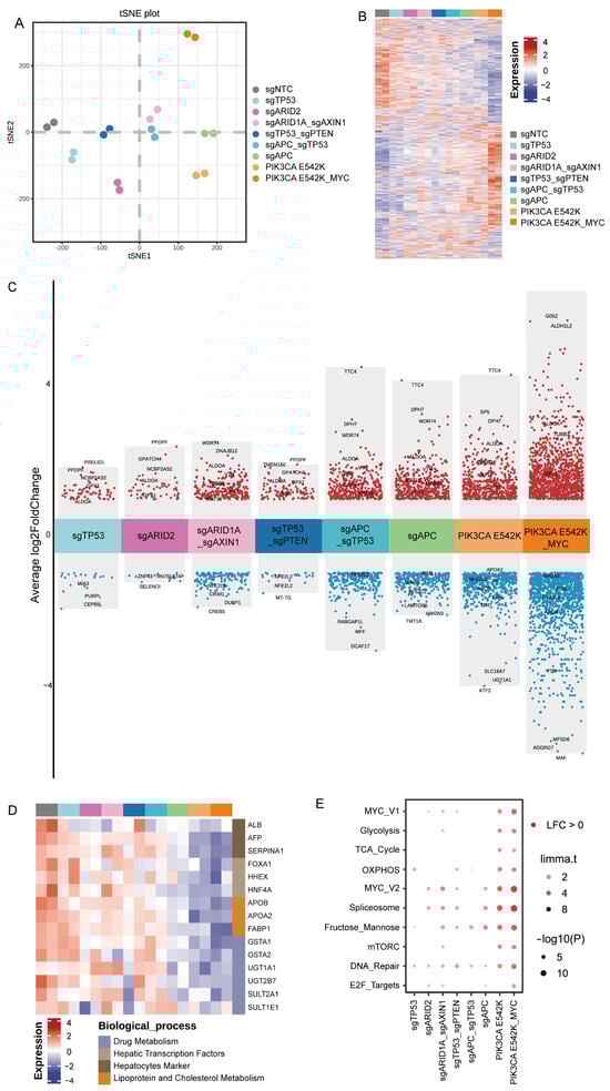 To test whether genome engineered hepatocytes resembled distinct tumor subtypes, we carried out transcriptome analysis of genetically manipulated cells isolated by FACS. The tSNE plot were used to visualize the overall relationship between the transcriptome of nine cell groups, each bearing distinct genotypes (Figure 4A). Notably, cells with identical genotypes clustered together, while those with different genotypes exhibited distinct transcriptional signatures (Figure 4B). Compared to the wild-type cells, the analysis of differential gene expression identified a significant number of upregulated and downregulated genes for each genotype. In particular, we observed that hepatocyte secretion proteins albumin, alpha-fetoprotein, and alpha-1-antitrypsin (encoded by ALB, AFP, and SERPINA1, respectively) were drastically downregulated in the PIK3CA-E542K, PIK3CA-E542K/c-MYC, and sgAPC groups, indicating these cell groups lost mature hepatic function after malignant transformation (Figure 4C,D). Similarly, decreased expressions of many hepatocyte functional markers, including hepatic transcription factors (FOXA1, HNF4A), drug metabolism genes (GSTA1, UGT1A1), and cholesterol metabolism genes (APOB, APOA2) were also observed in these groups (Figure 4D). Gene set variation analysis (GSVA) revealed that the hallmark of Myc targets, spliceosome pathway and DNA repair pathway, were activated by the introduction of oncogenic alteration. Interestingly, we observed increased activities of glycolysis, TCA cycles, oxidative phosphorylation, and fructose and mannose metabolism in the PIK3CA-E542K and PIK3CA-E542K/c-MYC groups, suggesting metabolic reprogramming occurred during the PI3KCA-driven cancer progression (Figure 4E).