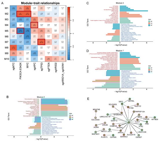 These malignant cells, derived from the same parental cells and sharing the same genetic background, were genetically engineered to differ only in specific oncogenic alterations. This allowed us to investigate the gene expression modules responsive to each oncogenic alteration, without confounding effects of complicating genetic background noise. Using weighted gene co-expression network analysis (WGCNA), we identified 10 distinct modules from the transcriptomic profiles across nine sample groups, with module sizes ranging from 75 to 2064 genes. We hypothesized that each oncogenic alteration would regulate a unique downstream transcriptional program, whether present alone or in combination with other alterations. Consequently, we tested the correlation of gene expression modules with the individual manipulated genes, except for the ARID1A/AXIN1 double-knockout. Notably, module 2 was highly correlated with PI3KCA and MYC alterations, while module 4 and module 7 were significantly associated with APC and TP53 knockouts, respectively (Figure 5A).