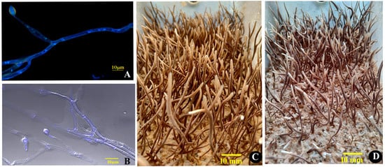 Ophiocordyceps xuefengensis. Micrographs of MAT1-1 hyphae (A) and MAT1-2 hyphae (B); macrographs of MAT1-1 fruiting bodies (C) and MAT1-2 fruiting bodies (D). Scale bars: (A,B) = 10 µm; (C,D) = 10 mm.
