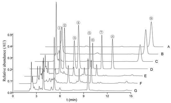 HPLC profile of nucleosides, nucleobases, and ergosterols from O. xuefengensis. A–C: Ergosterol (A. standard sample; B. MAT1-2 fruiting bodies; C. MAT1-1 fruiting bodies); D–G: nucleosides and nucleobases (D. standard sample; E. MAT1-2 fruiting bodies; F. MAT1-1 fruiting bodies; G. natural fruiting bodies). 1. uracil; 2. uridine; 3. inosine; 4. guanosine; 5. adenine; 6. thymidine; 7. adenosine; 8. cordycepin; and 9. ergosterol.