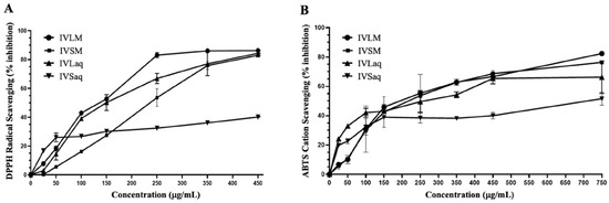 The antioxidant capacity of I. viscosa extracts was measured using DPPH and ABTS antioxidant assays. The antioxidant activity varied substantially depending on the extraction solvent and plant part. IVLM antioxidant capacity in DPPH and ABTS assays was superior to all other extracts regardless of solvent or plant part (Table 1 and Figure 1). IVLM DPPH antioxidant capacity EC50 value was 145.7 ± 2.6 µg/mL, followed by the leaves aqueous extract (IVLaq) with an EC50 of 155.8 ± 6.0 µg/mL (Table 1 and Figure 1A). The plant part was a determining factor of the DPPH antioxidant scavenging capacity. The leaves showed consistently better radical scavenging capacity than stems in both solvents. Indeed, IVLM and IVLaq showed lower radical scavenging EC50 values than IVSM and IVSaq (Table 1 and Figure 1A). Furthermore, methanol was a better extraction solvent than water for each plant part in relation to free radical antioxidant capacity. For stems, the methanolic extract IVSM had a higher antioxidant capacity (EC50 = 229.7 ± 3.1 µg/mL) than that of aqueous stems extract IVSaq (EC50 = 693.8 ± 3.4 µg/mL), which had the lowest antioxidant capacity of all extracts. For the leaves extract, the methanol extract IVLM antioxidant capacity was slightly higher than the leaves aqueous extract IVLaq (Table 1 and Figure 1A).