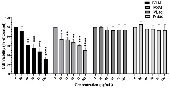 Aqueous and methanolic extracts of I. viscosa stems and leaves were evaluated for their cytotoxic effects against A549 lung cancer cells by the MTT assay. Results revealed that methanolic extracts of both the stems and leaves had noticeably superior cytotoxic effects against A549 cells than their aqueous counterparts. Both VLM and IVSM extracts significantly reduced the viability of A549 cells, while IVLaq and IVSaq did not affect A549 cell viability (Figure 2). Furthermore, IVLM reduced the viability of A549 cells to a higher extent than IVSM (IVLM IC50 = 68.7 ± 1.4 µg/mL while IVSM IC50 = 97.3 ± 1.3 µg/mL) (Figure 2). IVLM reduced the viability of A549 cells concentration-dependently starting at 20 µg/mL, but the effect was significant (p < 0.001) beginning at 40 µg/mL. IVSM also significantly reduced A549 cell viability dose-dependently, starting at the lowest tested concentration of 20 µg/mL (Figure 2).