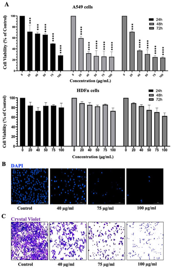 The MTT assay is essentially a metabolic assay that indirectly measures cell viability; therefore, cell viability was evaluated using DAPI and crystal violet staining methods, which directly assess cell viability. A549 cells treated with varying concentrations of IVL DCM were stained with DAPI nuclear stain (Figure 3B) and crystal violet (Figure 3C), which labels adherent cells. Both crystal violet and DAPI staining confirmed that IVL DCM potently reduced the viability of A549 lung cancer cells in a concentration-dependent manner (Figure 3B,C).