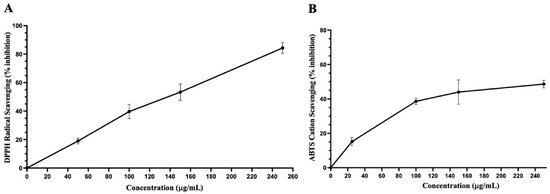 Antioxidant capacities of IVL DCM. (A) DPPH free radical scavenging activity of IVL DCM fraction (25–250 μg/mL). (B) ABTS• cation scavenging activity of IVL DCM fraction (25–250 μg/mL). Ascorbic acid was used as a reference. Values are expressed as means ± SEM (n = 3). These graphs were used to calculate EC50, as shown in Table 2.