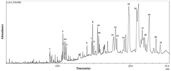 Chromatogram of GC-MS analysis of IVL DCM fraction representing the elution profile of metabolites listed in Table 5.