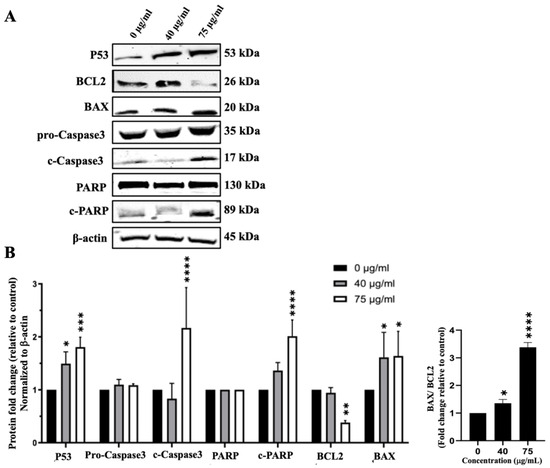 In addition to inhibiting cell proliferation, IVL DCM could reduce cell viability by inducing apoptosis. To detect the effects of IVL DCM fraction on the apoptosis pathway, protein levels of Caspase3, c-Caspase3, BCL2, BAX, PARP, c-PARP, and P53 were evaluated by immunoblotting of A549 cells treated with 40 and 75 μg/mL of IVL DCM. P53 protein levels gradually and significantly increased when increasing the concentration of IVL DCM from 40 (p < 0.05) to 75 μg/mL (p < 0.001) by 1.49 ± 0.13 and 1.81 ± 0.10 folds, respectively (Figure 7), indicating the activation of the apoptotic pathway. Protein levels of activated apoptosis effector enzyme c-Caspase3 were significantly (p < 0.0001) elevated by 75 μg/mL of IVL DCM (2.17 ± 0.44-fold change) (Figure 7). Similar to P53, the protein levels of the active PARP enzyme, c-PARP, increased dose-dependently at 40 and 75 μg/mL of IVL DCM. However, the increase was significant (p < 0.0001) only at 75 μg/mL of IVL DCM (2.01 ± 0.16-fold change) (Figure 7). The levels of the anti-apoptotic protein BCL2 decreased significantly (p < 0.0001) by 0.38± 0.05 folds at 75 μg/mL of IVL DCM (Figure 7). In contrast, the levels of the proapoptotic protein BAX increased significantly (p < 0.001) by 1.61 ± 0.33 and 1.64 ± 0.34 folds at 40 and 75 μg/mL of IVL DCM, respectively (Figure 7). The ratio of BAX/BCL2, which is indicative of induction of apoptosis, increased significantly (p < 0.001) at 40 and 75 μg/mL of IVL DCM by 2.26 ± 0.34 and 5.25 ± 1.26 folds, respectively.