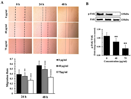 IVL DCM-induced reduction in cell migration appears to be FAK-mediated. Treatment of A549 cells with 40 and 75 µg/mL of IVL DCM for 48 h reduced the activation of FAK (Figure 8B), which plays a crucial role in cellular adhesion and migration, further supporting the antimigratory effects of IVL DCM. Treatment with 40 μg/mL and 75 μg/mL IVL DCM reduced the phosphorylation of FAK at Tyrosine 397 by 0.75 ± 0.21 and 0.35 ± 0.18 folds, respectively, underscoring the involvement of FAK in IVL DCM-induced inhibition of migration.