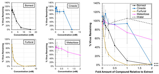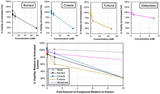 Each of the major compounds were analyzed for cytotoxicity at concentrations ranging from 0.001 times to 10 times the amount present in the plant extracts from which they were derived (Figure 5). All four compounds induced reductions in cell viability at the 1× concentration (equivalent to the relative concentration present in the plant extract) with cell viability. However, the cell viability remained greater than 61% for all compound treatments at 1× concentration. Consistent with this observation, the CC50 was determined for each of the treatments, and all treatments required greater than 1× concentrations, which ranged from 5.74× (furfural) to 19.09× (melezitose), to induce a 50% reduction in cell viability. When 10× concentrations were used, the cell viability was reduced by approximately 80% for borneol (23% viability at 77 mM), cineole (22% at 52 mM), and furfural (23% at 48 mM) treatments, and approximately 25% for melezitose treatment (73% viability at 10 mM). Collectively, none of the pure compounds exhibited comparable cytotoxicity to the extracts from which they were each derived (Figure 2).