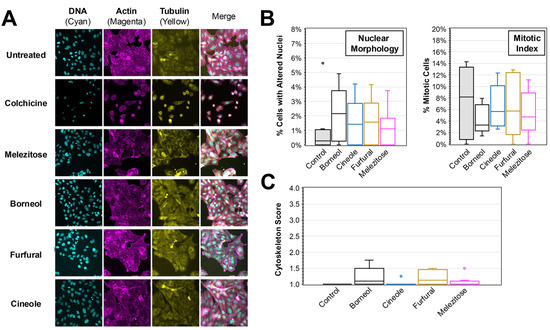 Immunofluorescence analysis was performed on each of the compounds to evaluate any impacts that they have on cell morphology or induction of apoptosis (Figure 6). No significant differences were observed in the immunofluorescence images obtained for DNA, actin, or tubulin staining (Figure 6A). Consistent with the images, blind scoring of the number of cells with altered nuclei or mitosis revealed no significant differences. The average percent of cells with altered nuclei ranged from 1.2% (melezitose) to 2.1% (borneol) for compound treatments compared to the control treatment (1.1%) (Figure 6B). The average percent of cells in mitosis ranged from 4.1% (borneol) to 6.6% (furfural) for compound treatments compared to the control treatment (7.4%). Lastly, none of the treatments resulted in an average cytoskeletal alteration score greater than 2 indicating no appreciable disruption of cytoskeleton arrangement among the treatments (Figure 6C).