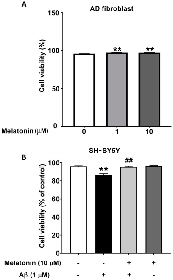 The effect of melatonin on the cell viability of AD fibroblasts after addition of 1 µM and 10 µM melatonin for 24 h (A). The effect of melatonin on the cell viability of Aβ-treated SH-SY5Y cells after addition of 1 µM melatonin for 24 h (B). The results were collected and analyzed by Muse 1.9 analysis software. Data are expressed as mean ± SEM calculated using one-way ANOVA and Tukey’s post hoc test with significant difference at ** = p < 0.01 when compared to untreated controls, and ## = p < 0.01 when compared to Aβ-treated SH-SY5Y cells (n = 4).