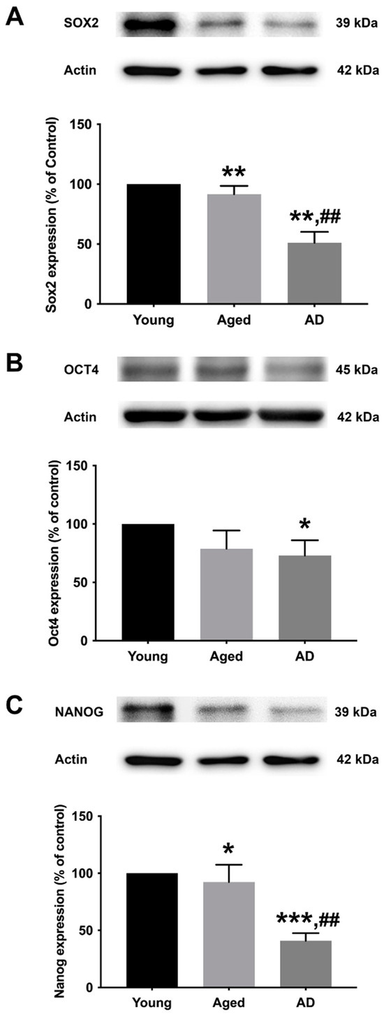 The expression levels of (A) Sox2, (B) Oct4, and (C) Nanog in young, aged, and Alzheimer’s skin fibroblasts. Young, aged, and Alzheimer’s skin fibroblasts were cultured in serum-free media for 24 h before being analyzed for Sox2, Oct4, and Nanog expression levels via Western blotting with actin as a loading control. Results are reported as percentage of the young fibroblast. Data are expressed as mean ± SEM with significant difference at * = p < 0.05, ** = p < 0.01, and *** = p < 0.001 of aged or Alzheimer’s groups compared to young control groups and at ## = p < 0.01 of Alzheimer’s compared with aged groups. Data were calculated using one-way ANOVA and Tukey’s post hoc test (n = 3).