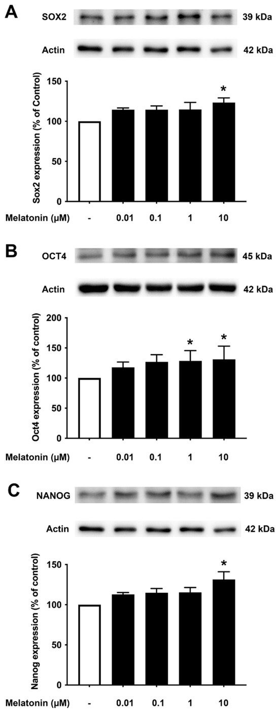 The effect of various concentrations of melatonin on (A) Sox2, (B) Oct4, and (C) Nanog expression levels in aged skin fibroblasts. Aged skin fibroblasts were incubated in various (0.01, 0.1, 1, 10 µM) concentrations of melatonin in serum-free media for 24 h. Control cells were cultured in serum-free media for 24 h. Western blotting was used for the analysis of protein expression levels with actin as a loading control. Results are reported as a percentage of the control. Data are expressed as mean ± SEM calculated using one-way ANOVA and Tukey’s post hoc test with significant difference at * = p < 0.05 when compared to untreated controls (n = 4).