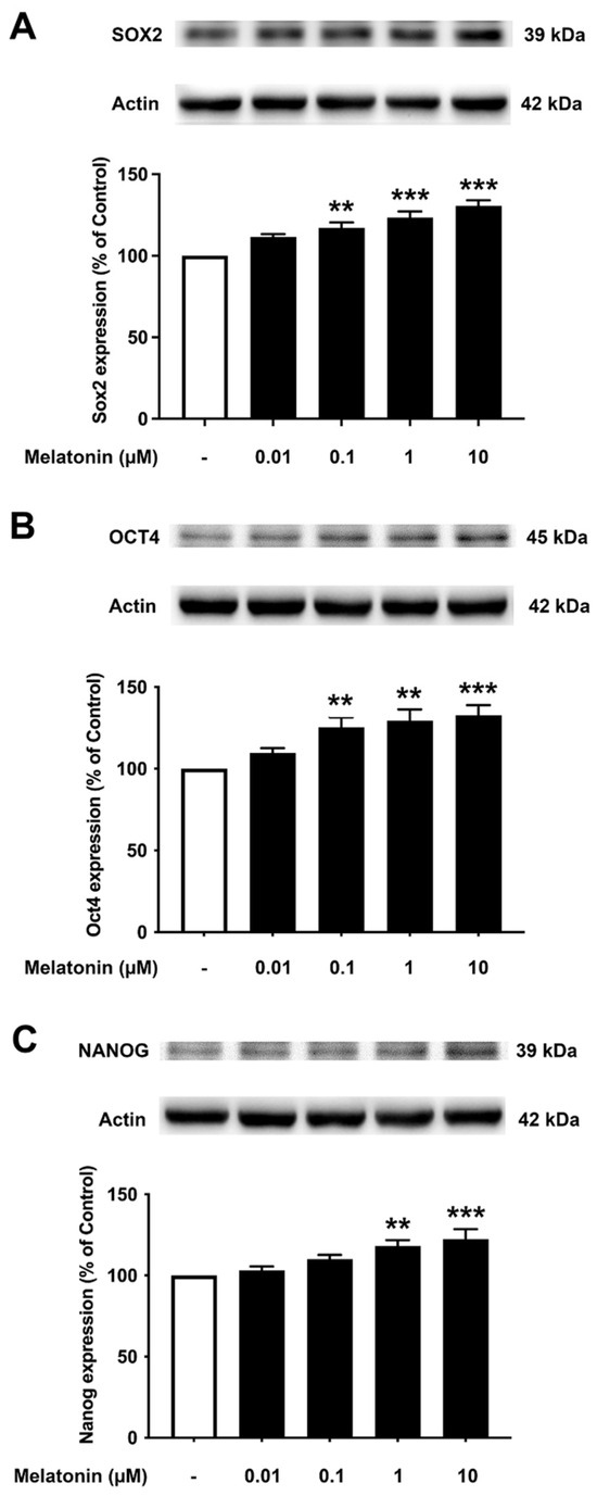 The effect of various concentrations of melatonin on (A) Sox2, (B) Oct4, and (C) Nanog expression levels in SH-SY5Y cells. SH-SY5Y cells were incubated in various concentrations (0.01, 0.1, 1, 10 µM) of melatonin for 24 h in serum-free media. Control cells were cultured in serum-free media for 24 h. Western blotting was used to analyze the expression of the protein with actin as a loading control. Results are expressed as a percentage of the control. Data are expressed as mean ± SEM with statistical significance at ** = p < 0.01 and *** = p < 0.001 when compared to untreated controls. Data are calculated using one-way ANOVA and Tukey’s post hoc test (n = 4).