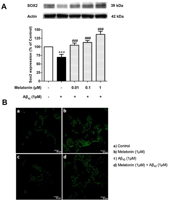 The effect of melatonin on the expression level of (A) Sox2 treated with Aβ42 in SH-SY5Y cells. Cells were pretreated with varying concentrations of melatonin (0.01, 0.1, 1 µM) for 2 h before being incubated with 1 µM of Aβ42 for another 24 h in serum-free media. Control cells were cultured in serum-free media for 24 h. Protein expression levels were analyzed using Western blotting with actin as a loading control. Results are expressed as a percentage of the control. Data are reported as mean ± SEM with significant difference at *** = p < 0.001 compared to untreated controls, and ### = p < 0.001 compared to Aβ42-treated groups. Data are calculated using one-way ANOVA and Tukey’s post hoc test (n = 4). (B). Immunostaining of SH-SY5Y cells demonstrating Sox2 expression (green). (a) Control cells were incubated in serum free media for 24 h. (b) Cells were treated with 1 µM melatonin alone for 24 h. (c) Cells were treated with 1 µM Aβ42 alone for 24 h. (d) Cells were pretreated with 1 µM melatonin for 2 h prior to 24 h 1 µM Aβ42 treatment. The green color indicates Sox2-positive immunostaining using Alexa 488-conjugated goat anti-rabbit IgG. Scale bar equals 30 μm.