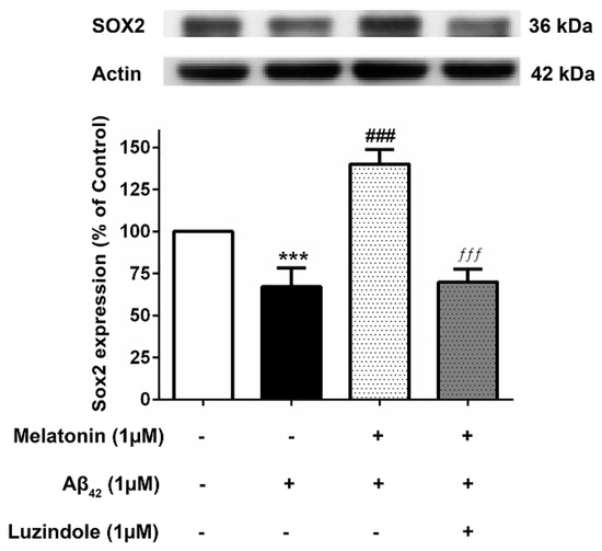 The effect of luzindole on Sox2 expression levels in the presence of melatonin and Aβ42. SH-SY5Y cells that were pretreated with 1µM melatonin and treated with 1 µM Aβ42 were incubated with 1 µM luzindole in serum-free media for 24 h and observed in comparison to the pretreatment group without luzindole, the 1 µM Aβ42-only treated group, and the control group cultured only in serum-free media for 24 h. Protein expression levels were then analyzed with Western blotting with actin as a loading control. Results are illustrated as a percentage of control. Data are expressed as mean ± SEM with statistical significance at *** = p < 0.001 compared to untreated controls, ### = p < 0.001 compared to the Aβ42-treated group, and ƒƒƒ = p < 0.001 compared to the melatonin pretreated without luzindole group. Data are calculated using one-way ANOVA and Tukey’s post hoc test (n = 4).
