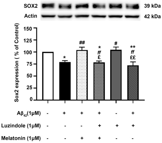 The effect of melatonin post-treatment and luzindole on Aβ42-induced changes in Sox2 expression in SH-SY5Y cells. SH-SY5Y cells were incubated at 37 °C with and without 1 µM Aβ42 for 30 min in serum-free media, followed by treatment with and without 1 µM luzindole for 30 min before 1 µM melatonin post-treatment for an additional 24 h. The analysis of Sox2 expression was performed by Western blot analysis. The band densities were normalized to actin. The ratios were calculated as a percentage of the respective value in the control (untreated) group. The data are expressed as the means ± SEM. One-way ANOVA and Tukey’s post-hoc test were performed for statistical analysis. (* and ** denote statistical significance at p < 0.05 and p < 0.01 compared to the control group, respectively; # and ## denote statistical significance at p < 0.05 and p < 0.01 compared to the group treated with Aβ42 alone, respectively; ff denotes statistical significance at p < 0.01 compared to the melatonin post-treatment group; and £ and ££ denote statistical significance at p < 0.05 and p < 0.01 compared to the group treated with luzindole alone).