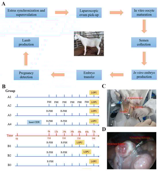 The experimental procedures of laparoscopic ovum pick-up (LOPU) and in vitro embryo production (IVEP) technologies. (A) Schematic diagram of LOPU and IVEP steps. (B) Goat superovulation protocols in each group. (C) LOPU of goats with abdominal puncture. (D) Ovarian fixation in LOPU.