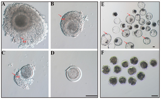 Oocyte quality classification and early embryonic development. (A) Homogeneous cytoplasm, encapsulated by at least 3 layers of granulosa cells is defined as grade A; (B) encapsulated by 1–2 layers of granulosa cells is defined as grade B; (C) homogeneous cytoplasm but not evenly encapsulated by granulosa cells is defined as grade C; (D) inhomogeneous cytoplasm or semi-transparent cytoplasm, dead or degenerate oocytes is defined as grade D. Scale bar, 100 µm. Arrows indicate ovarian granulosa cells. Development of embryos in vitro at 48 h (E) and 168 h (F). Scale bar, 100 µm. Arrows indicate blastocysts.