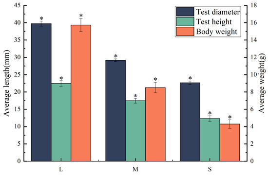 Different sizes of sea urchin test diameter, test height, and body weight. “*” indicates significant differences among different groups, p < 0.05.
