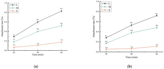 (a) Attachment rates of sea urchins of different sizes within 60 min when food is sufficient. (b) Attachment rates of sea urchins of different sizes within 60 min under food shortage conditions. (* p < 0.05 vs. S group; ^ p < 0.05 vs. M group; + p < 0.05 vs. L group).