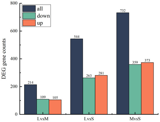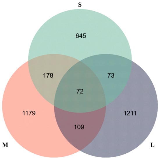 Differential gene screening showed that a total of 214 DEGs were screened out between group L (large-sized sea urchins) and group M (medium-sized sea urchins) (|log2(FC)|≥1 and p ≤ 0.05), of which 105 were upregulated and 109 were downregulated; 544 DEGs were screened out between group L and group S (small-sized sea urchins), of which 281 were upregulated and 263 were downregulated; and 732 DEGs were screened out between group M and group S, of which 373 were upregulated and 359 were downregulated (Figure 6).