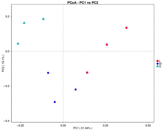 Alpha-diversity metrics were calculated for each size group to evaluate the abundance and diversity of intestinal flora of sea urchins of different sizes. There were no significant differences between the values of the Chao1 index of species richness and the Shannon index of species diversity among the three size groups (p > 0.05), but there were differences in both indices among the groups. Values of the Chao1 index for the large-sized, medium-sized, and small-sized groups were 591.09, 563.43, and 383.62, respectively. The Shannon index of the large-sized group (5.15) was higher than that of the medium-sized (5.02) and small-sized (1.99) groups. Principal coordinate analysis (PCoA) showed that the intestinal bacterial communities of large-sized and small-sized sea urchins were significantly separated (Figure 4). The top ten phylum-level intestinal microbiota ranked by relative abundance in each size group of sea urchins are shown in Figure 5a. The dominant phyla in all three sizes of sea urchins were Campylobacterota, Proteobacteria, and Firmicutes, although their relative abundances were very different. The relative abundance of Campylobacterota (34.7%) and Firmicutes (25.0%) were both higher in large-sized sea urchins than in medium-sized sea urchins (29.4% and 19.5%, respectively). The relative abundance of Proteobacteria was higher in medium-sized sea urchins (39.5%) than in large-sized sea urchins (28.4%). Notably, in small-sized sea urchins, the relative abundance of Campylobacterota was as high as 82.6%, which is much higher than that of large-sized and medium-sized sea urchins, whereas the relative abundance of Firmicutes (3.3%) and Proteobacteria (9.5%) were very low. At the family level (Figure 5b), the dominant families in large-sized sea urchins were Arcobacteraceae (34.64%), Lachnospiraceae (15.43%), Pseudomonadaceae (7.90%), and Rhodobacteraceae (4.92%); in medium-sized sea urchins, they were Arcobacteraceae (29.40%), Vibrionaceae (10.69%), Rhodobacteraceae (9.65%), and Planococcaceae (4.22%); and in small-sized sea urchins, they were Arcobacteraceae (82.55%), Vibrionaceae (2.44%), Pseudomonadaceae (2.19%), and Lachnospiraceae (0.61%). The family Arcobacteraceae was dominant in all three size groups, but its abundance was significantly higher in small-sized sea urchins than in the other two size groups. However, the abundances of families Lachnospiraceae and Pseudomonadaceae were significantly less in small-sized sea urchins compared with large-sized sea urchins.