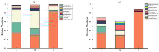 (a) Composition of gut microbiota at the phylum level of sea urchins of different sizes. (b) Composition of gut microbiota at the family level of sea urchins of different sizes.