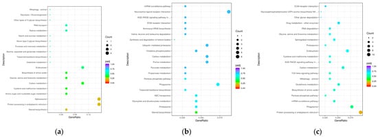 (a) KEGG pathway enrichment analysis of the DEGs in L vs. M group; (b) KEGG pathway enrichment analysis of the DEGs in L vs. S group; (c) KEGG pathway enrichment analysis of the DEGs in M vs. S group.