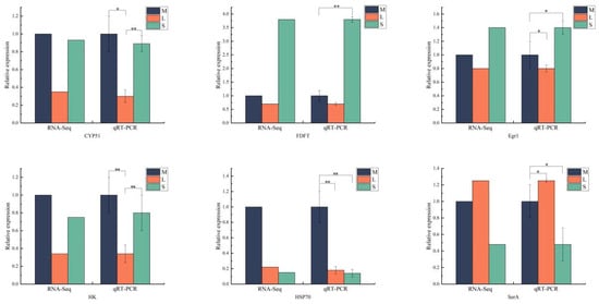 To confirm the accuracy of the DEGs identified in the RNA-seq expression analysis, we randomly selected seven genes from the DEGs screened in the mRNA library for verification. These genes may be related to growth differences, and primers were designed based on the sequences (Table 1). As shown in Figure 9, the RT-qPCR results were significantly correlated with the RNA-seq results (p < 0.05). Overall, the RT-qPCR results confirmed the RNA-seq results, indicating the reliability and accuracy of the expression analysis.
