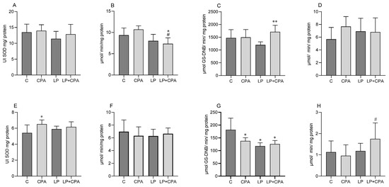 Analysis of enzymatic activities of male Swiss mice treated with LP (protium liposome) and CPA (cyclophosphamide). SOD: superoxide dismutase (A), CAT: catalase (B), GST: glutathione S-transferase (C), e GPX: glutathione peroxidase (D) in the liver; SOD: superoxide dismutase (E), CAT: catalase (F), GST: glutathione S-transferase (G), e GPx: glutathione peroxidase (H) in the kidney. The results are presented as mean ± standard deviation. ANOVA (two-way), followed by Tukey’s post-hoc test. * p < 0.05 vs. C; ** p < 0.05 vs. LP; # p < 0.05 vs. CPA; (n = 8).