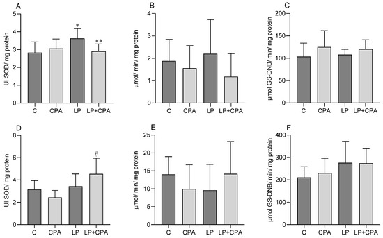 In cardiac tissue, a significant increase in the activity of the SOD enzyme was observed in the group treated with LP + CPA compared to the group that received only CPA (Figure 2D). Regarding the analysis of the activities of catalase and GST, no changes were identified between the groups analyzed (Figure 2E,F).