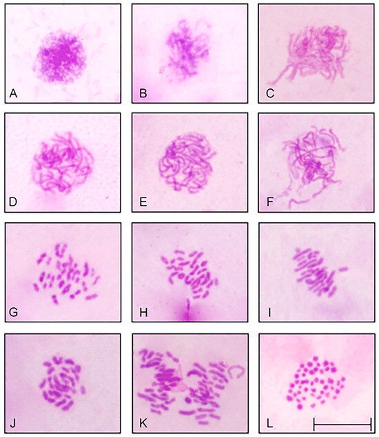 Rineloricaria lanceolata cells with conventional staining (Giemsa), 2n = 47. The dynamics of the gonadal cells of an adult male in meiotic division highlight the regularity of gamete formation, even though this individual has an odd diploid number. The karyotypic variants made possible by this process are shown in the idiogram in Figure 5. (A) Interphasis. (B) Zygotene. (C–F) Pachytene. (G) Diplotene. (H) Diacinesis. (I,J) Metaphasis I (two cells). (K) Metaphasis I. (L) Mitotic metaphasis. Scale: 10 µm.