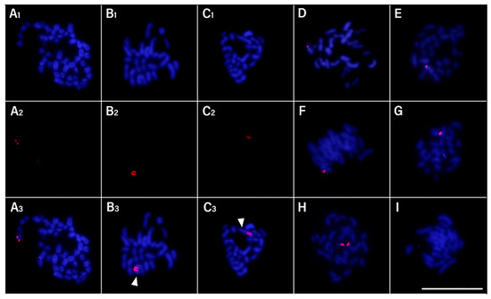 Rineloricaria lanceolata cells of the individual with 2n = 47 chromosomes with fluorescence in situ hybridization (FISH) using rDNA 5S probe (red) and DAPI counterstain. (A1–A3) Mitotic metaphasis. (B1–B3,C1–C3) Meiotic metaphasis. (D–I) All gamete segregation possibilities with emphasis on rearrangement-involved chromosomes during meiosis II are shown. Arrows: trivalent chromosomes paired in different positions during meiosis I. Scale: 10 µm.