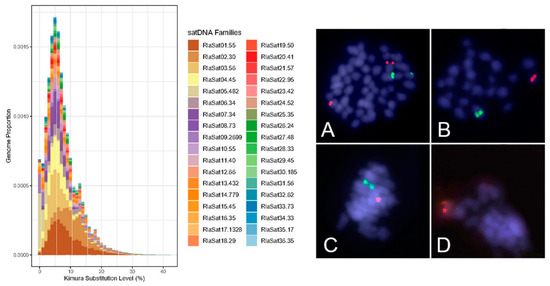 Satellite abundance and divergence profile data (left) and trivalent segregation highlighted by 5S probe (green) in contrast to bivalent conventional segregation shown with RlaSat17-1328 (red) in double FISH. (A) Mitotic metaphasis. (B) Meiotic metaphasis (n = 23) with the presence of submetacentric marked with 5S. (C) Meiotic metaphasis with both chromosomes marked with 5S. (D) Meiotic metaphasis with 5S marks absent. Note the satellite-marked chromosome is regularly present from (B–D) meiosis.