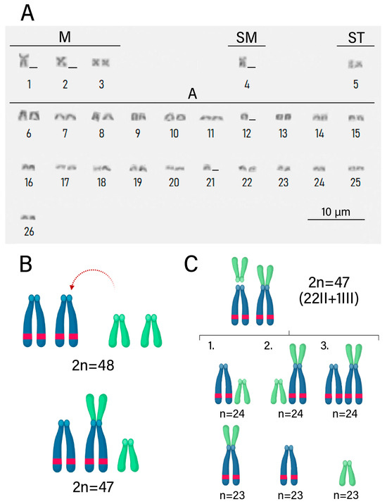 Teleosts are widely distributed globally and extremely diverse, with over 30,000 known species [1]. Reports of chromosomal polymorphisms in this vertebrate group are abundant [2,3,4,5,6]. The three-spined stickleback (Gasterosteus aculeatus, Linnaeus, 1758) is a notable example, exhibiting chromosomal polymorphism with variations in chromosome number and sex determination systems among different populations. These variations have significant implications for the adaptation and evolution of this species in various aquatic environments [7]. Salmonids, representing a family of ecologically and economically important fishes, are well known for their broad karyotypic variation due to chromosomal polymorphisms [8]. Recent genomic studies have aimed to link chromosomal variations to adaptation, particularly in Atlantic salmon (Salmo salar). A variant chromosomal translocation is strongly correlated with temperature in a population of S. salar in Canada [9]. This suggests that Robertsonian polymorphisms play a role in the local adaptation of Atlantic salmon to specific environments.