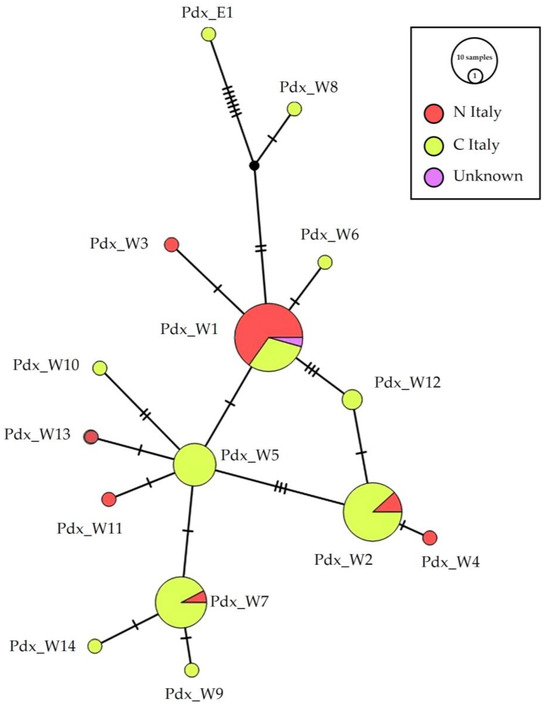 n = 9) was recorded only in Central Italy; the same applies for other eight low-represented haplotypes: Pdx_W6, Pdx_W8, Pdx_W9, Pdx_W10, Pdx_W12, Pdx_W13, Pdx_W14, Pdx_E1. Detailed information is shown in