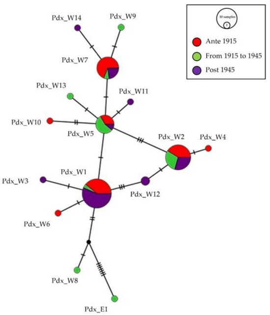 The samples collected before 1915 (n = 31) shared the haplotypes Pdx_W1 (n = 9), Pdx_W2 (n = 7), Pdx_W4 (n = 1), Pdx_W5 (n = 3), Pdx_W6 (n = 1), Pdx_W7 (n = 9), Pdx_W10 (n = 1).