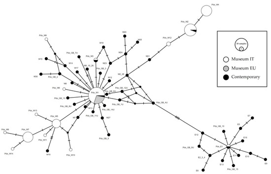 The Italian museum haplotypes were organized in two different phylogenetic lineages, both originating from the central haplotype Pdx_W1 (
