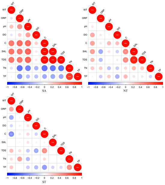 Correlation analysis of water environment parameters, red indicates a positive correlation and blue indicates a negative correlation, * Benjamini-Hochberg adjusted 0.01 ≤ p < 0.05; ** Benjamini-Hochberg adjusted 0.001 ≤ p < 0.01; *** Benjamini-Hochberg adjusted p < 0.001.