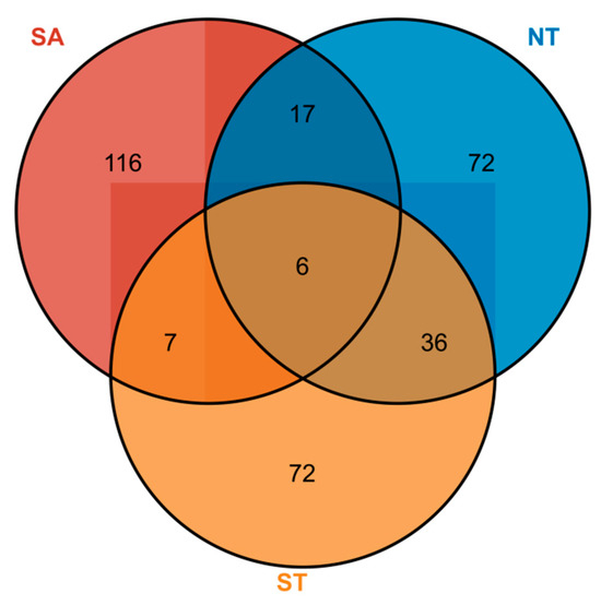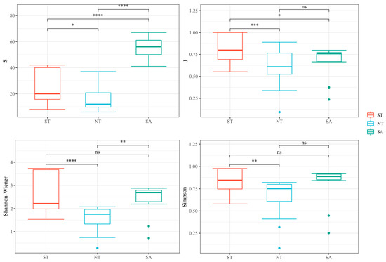 In several species, the SA significantly differed from both the ST and NT and substantially differed from the ST and NT. In terms of the Pielou index, the ST treatment significantly differed from the NT and SA treatments. In terms of the Shannon–Wiener index, the ST differed substantially from the NT, and the SA significantly differed from the NT. There was only a significant difference in the Simpson’s diversity index between the ST and NT treatments (Figure 5).