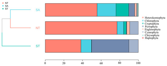 The average biomass of the SA phytoplankton was 2.34 ± 0.60 mg/L and the average density was 5,364,948.42 ± 1,763,474.55 cells/L; the average biomass of the ST phytoplankton was 0.07 ± 0.01 mg/L and the average density was 140,876.01 ± 17,322.17 cells/L; and the average biomass of the NT phytoplankton was 0.13 ± 0.04 mg/L and the average density was 461,002.07 ± 131,938.61 cells/L. Across all three areas, diatom species contributed the most to the phytoplankton community biomass. The biomass percentage of Chlorophyta was highest in the SA compared to the other two areas, whereas in the ST, Chlorophyta had a higher overall percentage relative to the other areas. A cluster analysis indicated that the SA was most closely related to the NT (Figure 4).