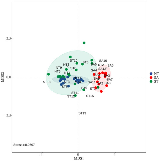 The NMDS results showed that the phytoplankton communities were more similar between the ST and NT, while the SA community was farther from the other two communities, indicating that they were more different. The stress value of 0.0697 indicated that the NMDS model fit the raw data well and could accurately reflect the similarities or differences between samples (Figure 6).