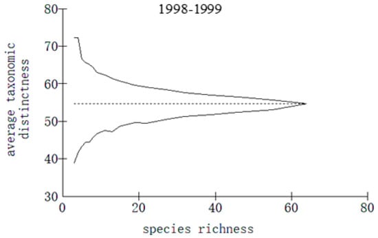 The taxonomic distinctness indices of fish in Meiji Reef at different points between 1998 and 2018 are depicted in Figure 5, Figure 6 and Figure 7. The Δ+ and Λ+ values of fish from 1998 to 2018 were recorded as 56.1 and 148.5, respectively. During the periods of 1998–1999 and 2016–2018, the Δ+ and Λ+ values stood at 54.7 and 155.2, respectively, with a subsequent increase to 56.3 and 161.6 for the latter period. This upward trend indicated an augmented genetic disparity among fish species in Meiji Reef over time, accompanied by a reduction in species classification uniformity.
