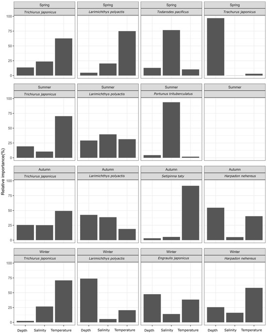 The relative importance of environmental factors for each fish species by season.