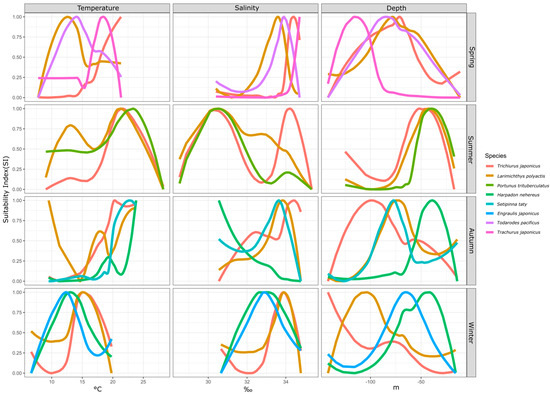 In spring, four fish species had a biomass proportion exceeding 5%: hairtail, small yellow croaker, Pacific squid, and Japanese jack mackerel. In terms of temperature suitability, small yellow croaker and Pacific squid had similar ranges, whereas hairtail and Japanese jack mackerel were more alike, with the latter group favoring higher average temperatures. The order of preferred temperature was hairtail > Japanese jack mackerel > Pacific squid > small yellow croaker. For salinity suitability, the four species were relatively close, with the order being Japanese jack mackerel > hairtail > Pacific squid > small yellow croaker. Regarding water depth suitability, Japanese jack mackerel preferred deeper waters, while hairtail, small yellow croaker, and Pacific squid showed similar depth preferences.