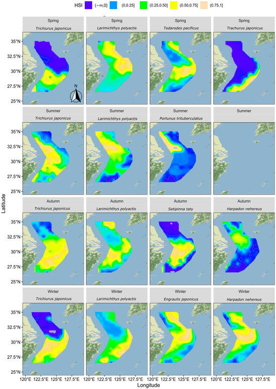 In spring, hairtail’s suitable habitat was primarily located in the southern waters, while the northern waters were generally unsuitable. The suitable habitat for small yellow croaker was mainly found in the outer northern waters, with lower suitability observed in other areas. Pacific squid’s suitable habitat was concentrated in the central and southern waters, as well as in the outer northern waters, with lower suitability elsewhere. For Japanese jack mackerel, the suitable habitat was mainly in the outer southern waters, with other areas deemed unsuitable.